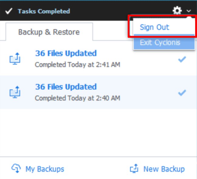 You can also log out of your Cyclonis Backup account from the traybar popup window. In the system tray, click the Cyclonis Backup icon to open the traybar popup window. Next, click the gear icon and select Sign Out from the menu.