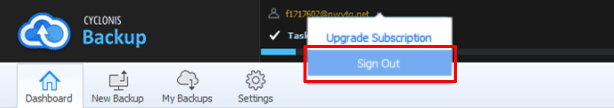 In the desktop app to log out of your Cyclonis Backup account, click the down arrow to the right of your email address in the main window info bar of the desktop application, as shown below, and click Sign Out.
