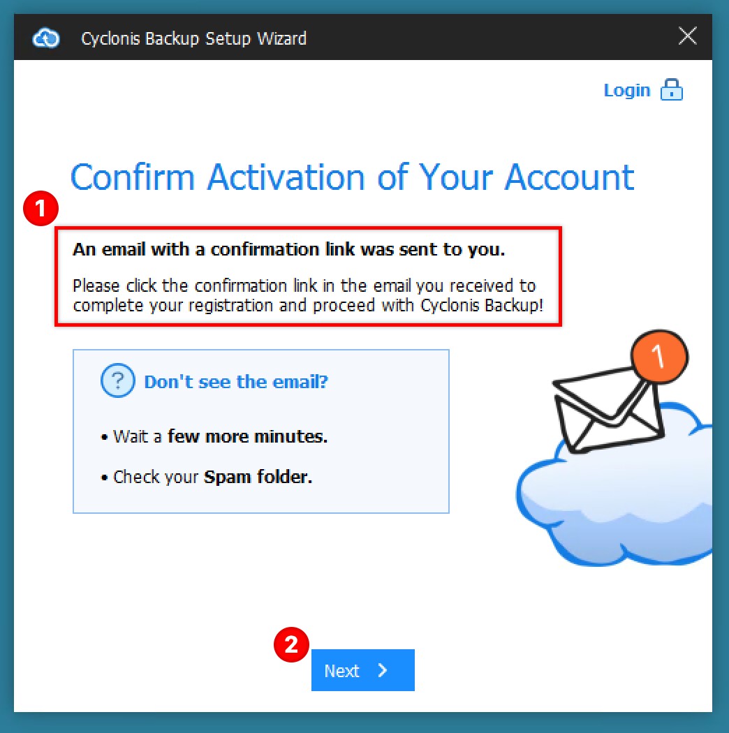 As part of the account creation process, Cyclonis Backup will send a confirmation link to the email address that you have entered. You will need to check your email and visit the link to activate your account. If the link doesn't arrive immediately, wait for a few minutes and check again. If you still cannot locate the confirmation email, you may wish to check your spam folder.
