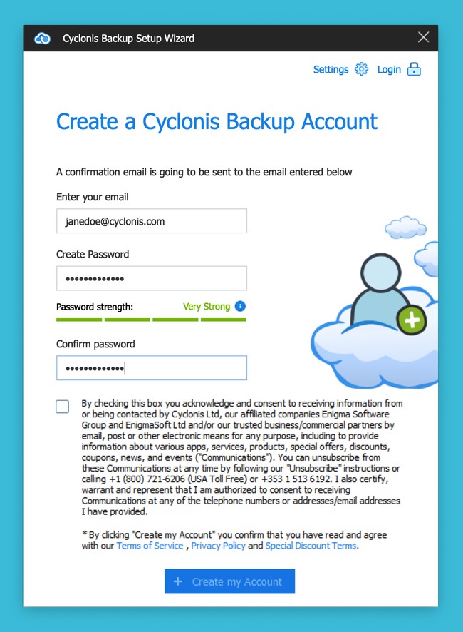 NOTE: Typically, your password should be between 6 and 50 characters long. The password strength meter visible on this screen will show you an estimation of its strength. To allow you flexibility in choosing the password that you prefer, there are no additional specific requirements for the type of characters you need to use for your password. We encourage you to protect your Cyclonis Backup account with a strong, unique and private password.