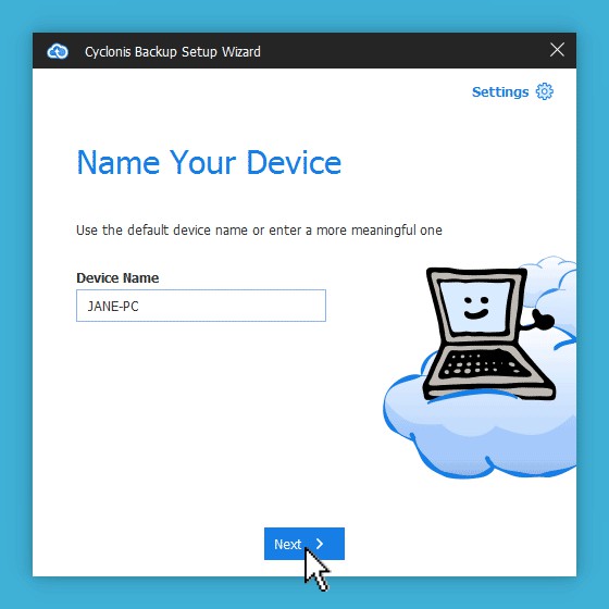 Next, return to the Cyclonis Backup app and click Next. Cyclonis Backup will now ask you to pick a name for the device you're using to create your account. This helps you to manage your backups if you use Cyclonis Backup on multiple devices. By default, Cyclonis Backup will display the computer name from your device's operating system settings. You may wish to edit the default name to a name of your choosing. If you wish, you can rename your device later.