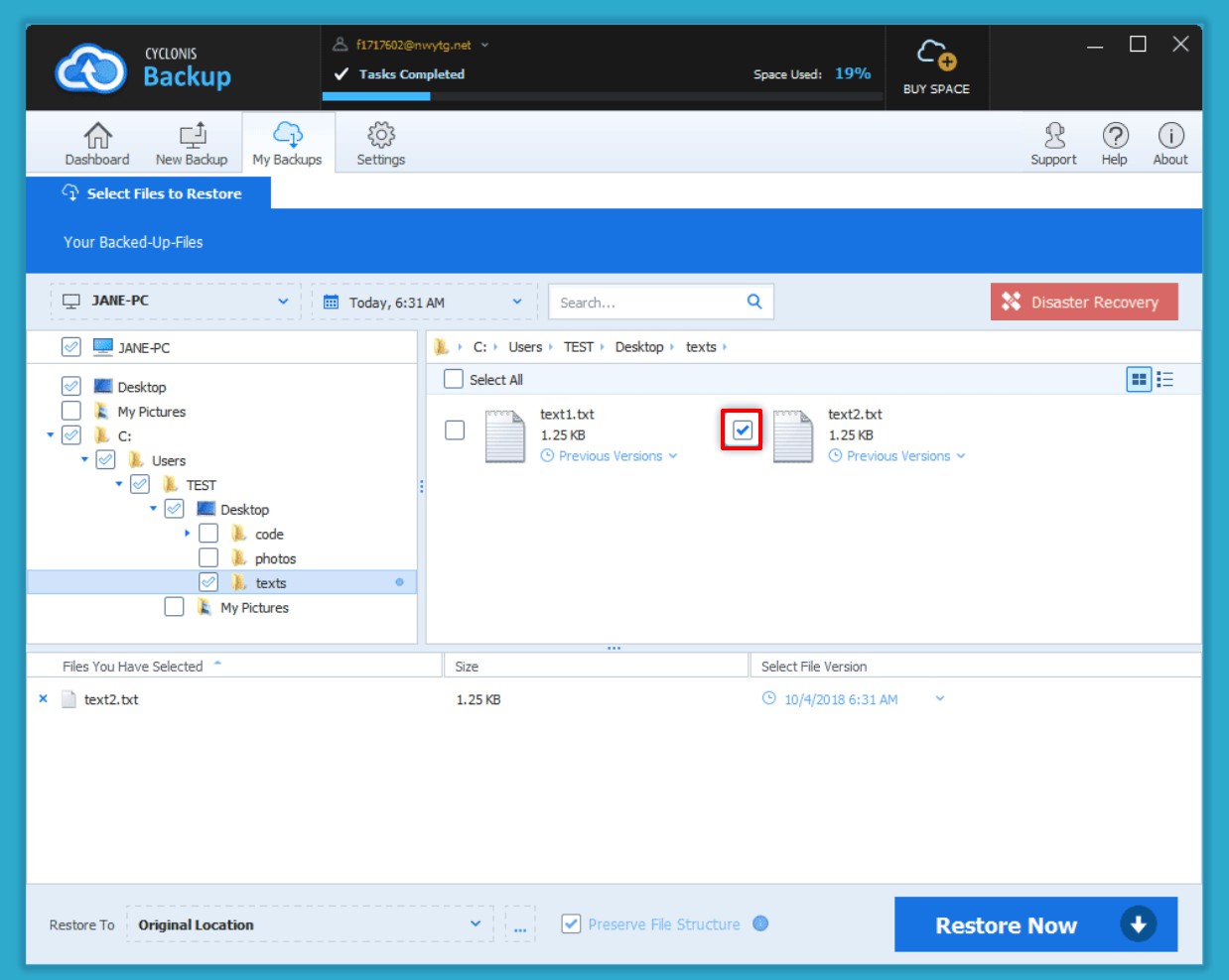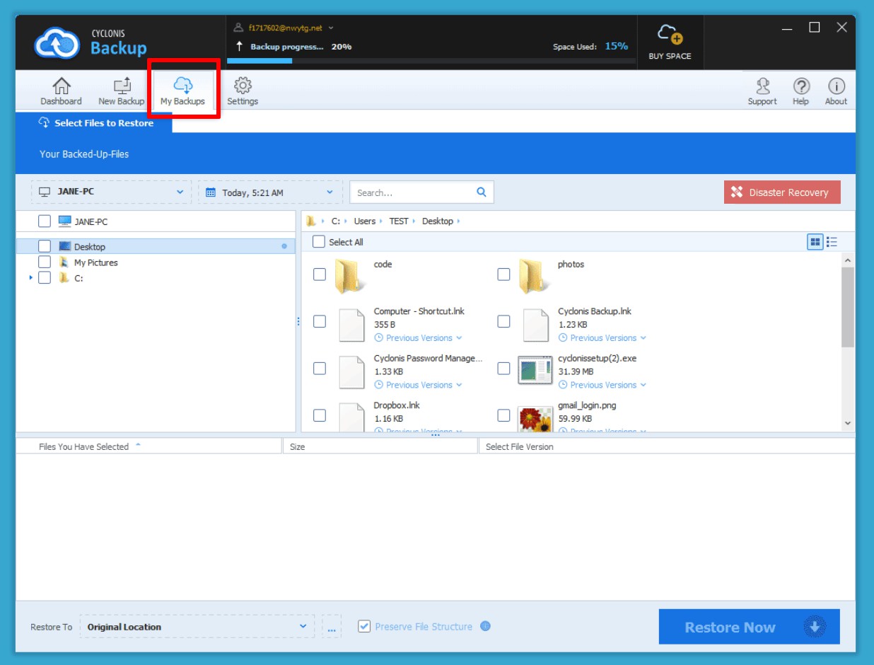 - Launch the Cyclonis Backup application and select My Backups from the top menu. Cyclonis Backup will display the files and folders that you have backed up from your current device. If you want to manage files that have been backed up from a different device, you must select that device name from the drop-down menu above the folder tree.