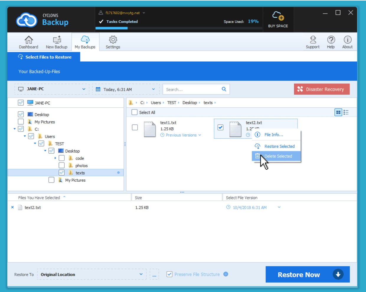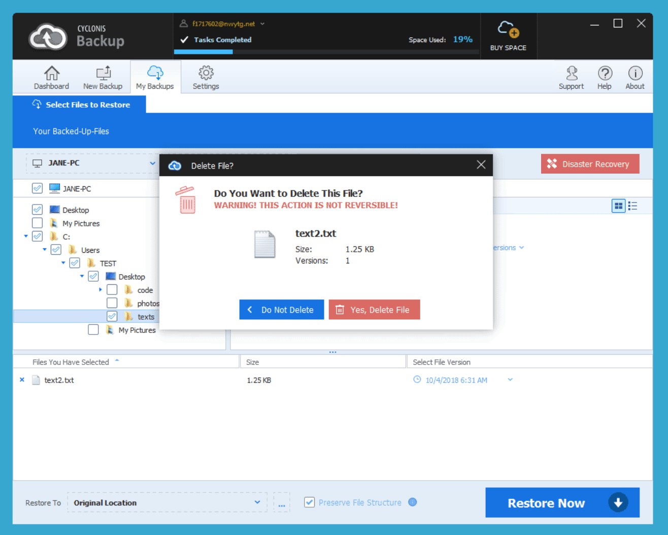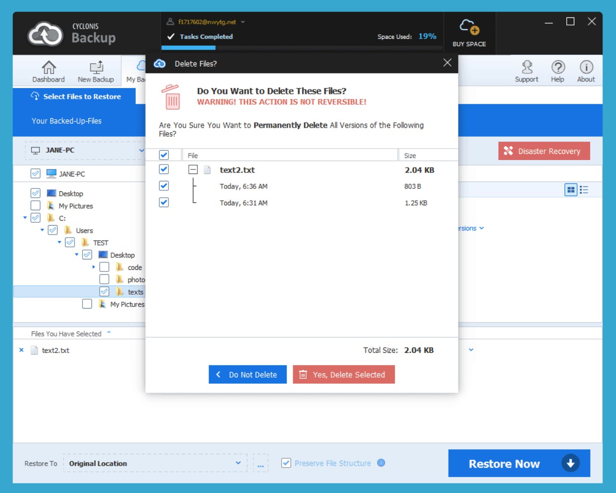 NOTE: Deleting files from your Cyclonis Backup cloud storage is NOT REVERSIBLE. To avoid data loss, make sure you no longer need the files you've selected before deleting them.