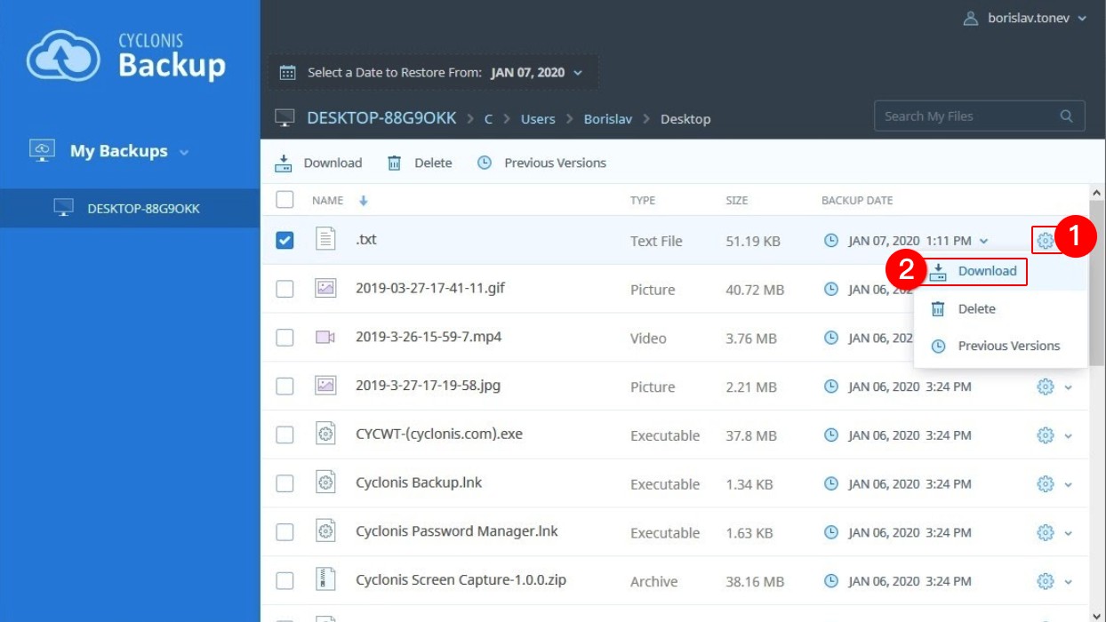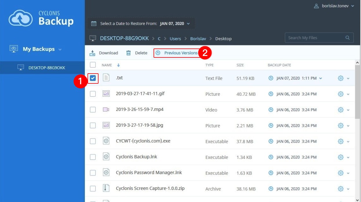 To view all available versions of specific files directly in the Cyclonis Backup web interface, simply select the checkbox next to the desired file (1), and click the Previous Versions button (2). Alternatively, you can select the Previous Versions button from the Gear icon next to a file, if available. NOTE: The Previous Versions button will be disabled in the following cases: 1) multiple checkboxes are selected, 2) a folder is selected, 3) there is only a single version of the selected file in your backup.