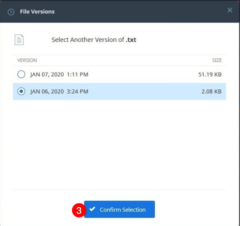 The available versions of the selected file will be displayed in a dialog. Select the version that you would like to restore and click Confirm Selection (3).