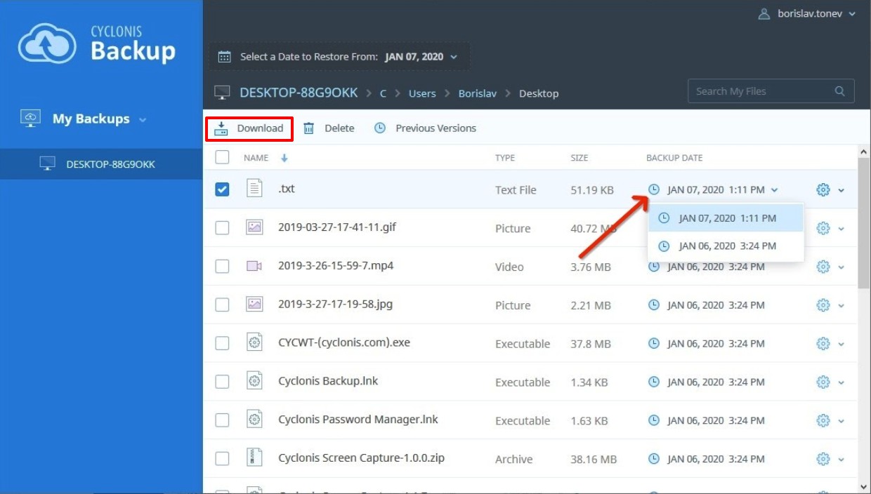 Additionally, if there are multiple versions of a file available in your backup, a down-arrow will be visible next to its date (in the Backup Date column). Click the date to display available versions and select the version that you would like to restore.