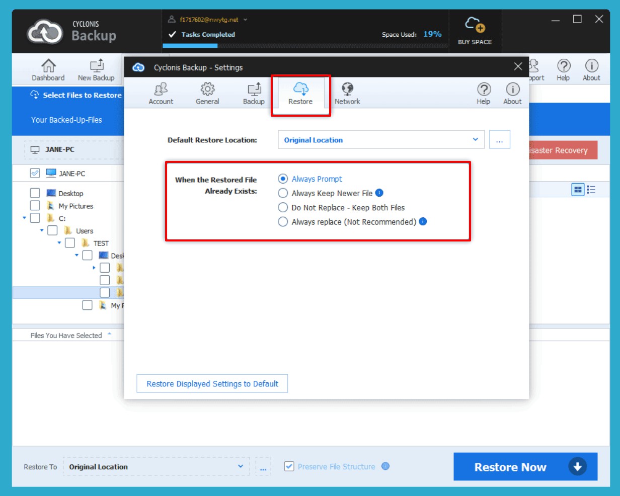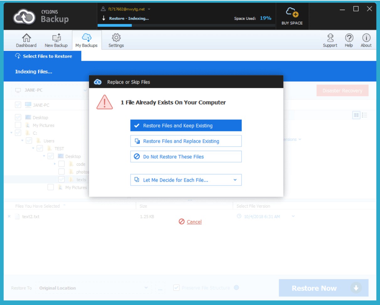 - Restore Files and Replace Existing – selecting this option deletes the existing file on your computer and replaces it with the version you have selected from Cyclonis Backup.