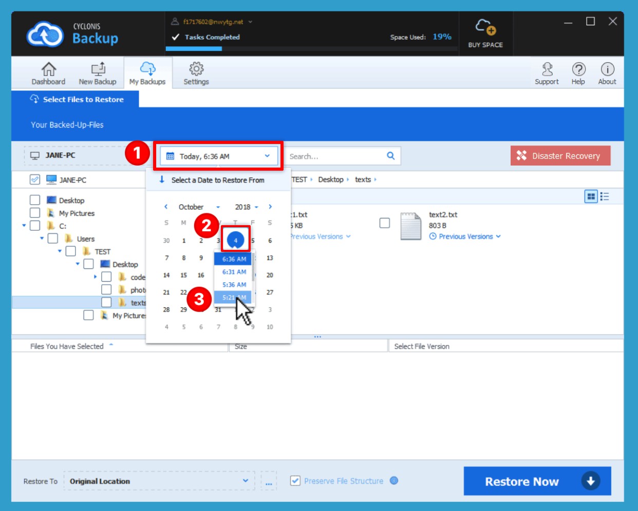 - Above the folder tree, there is a drop-down menu (1) which, by default, displays the date and time of the last backup. Opening it reveals a calendar (2) which displays all the backups that Cyclonis Backup has stored. If you select an earlier date (3) from the calendar, Cyclonis Backup will display the files and folders as they existed on your system at that point in time. If you select an earlier date and restore files or folders, the versions that existed at that point in time will be restored.This feature can be particularly useful in cases where your files have been compromised by ransomware or otherwise corrupted. To remedy this situation, select a date before the data corruption occurred and restore your files.