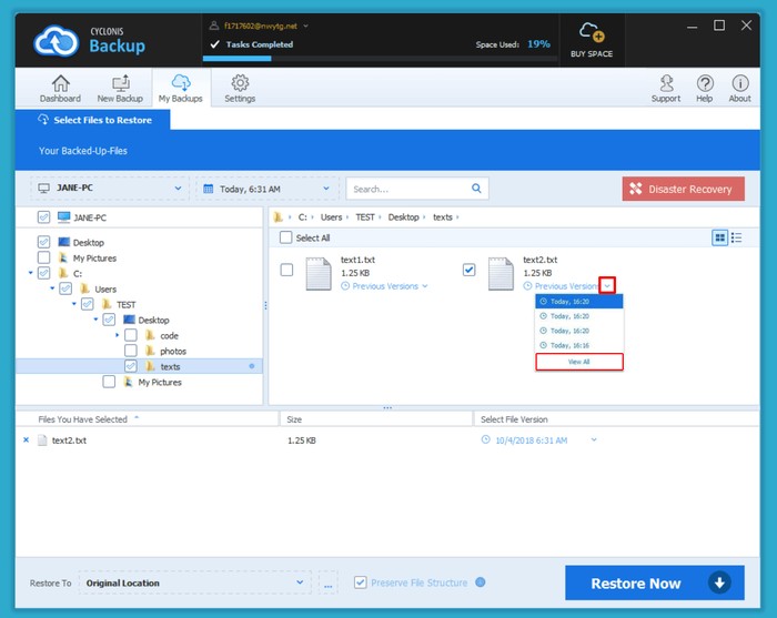 drop-down. Cyclonis Backup will display a list of previous versions of the file that are stored in your backup. The four most recent versions of the file will be displayed. If there are more than four versions of the file available, click "View All" to see all versions. Locate the desired version (by backup time) that you would like to restore and select it to add that specific version to the restore operation.