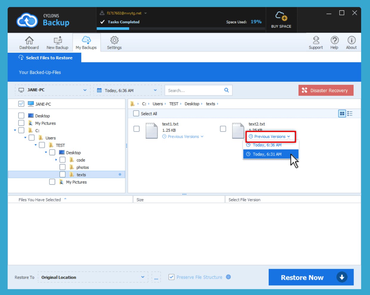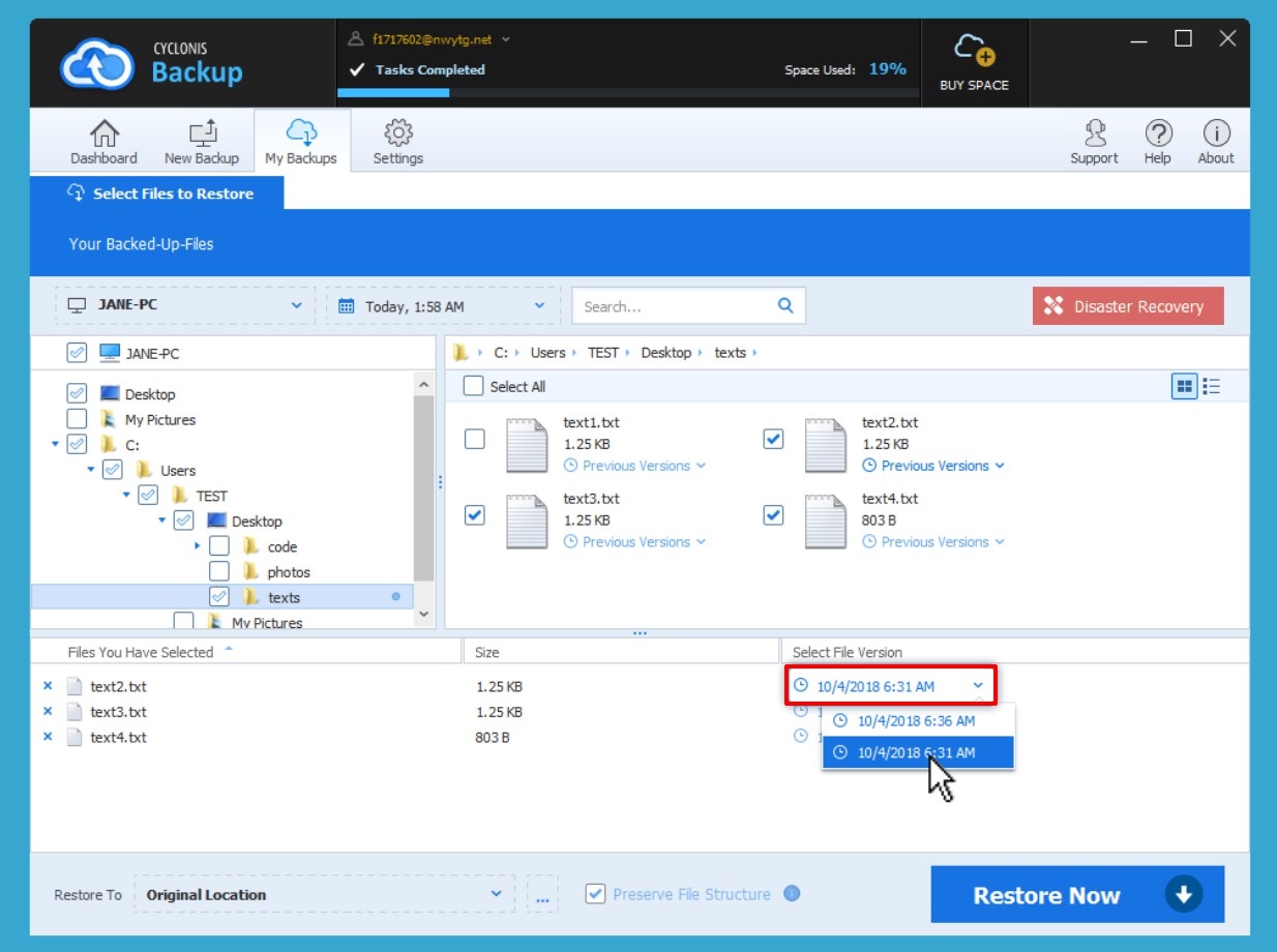 When you back up a file, modify the file and then back it up again, by default, Cyclonis Backup keeps both the original version and the new version of the file in your backup. If you make further modifications to a file, new versions will be stored as you run additional backups. When restoring, you can choose which version of the file to restore: