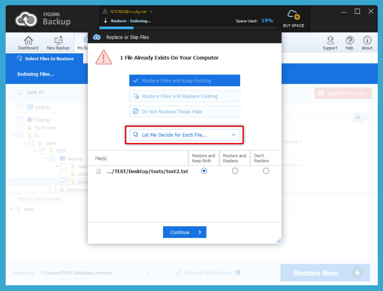 - Do Not Replace - Keep Both Files – This is the safest option. Every time you try to restore a file that already exists on your hard drive, Cyclonis Backup will rename the existing file on your computer (by adding (1), (2), (3), etc. after the file name) and restore the selected file (and version) from the cloud, saving it with its original name. If you wish, you can manually review the two files and decide which one you would like to keep (or simply keep both versions).
