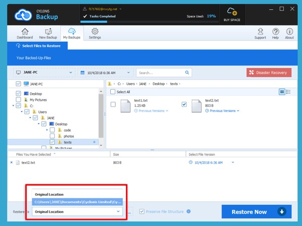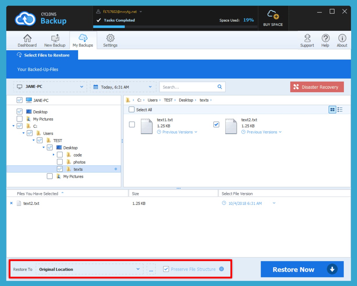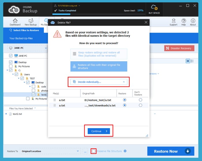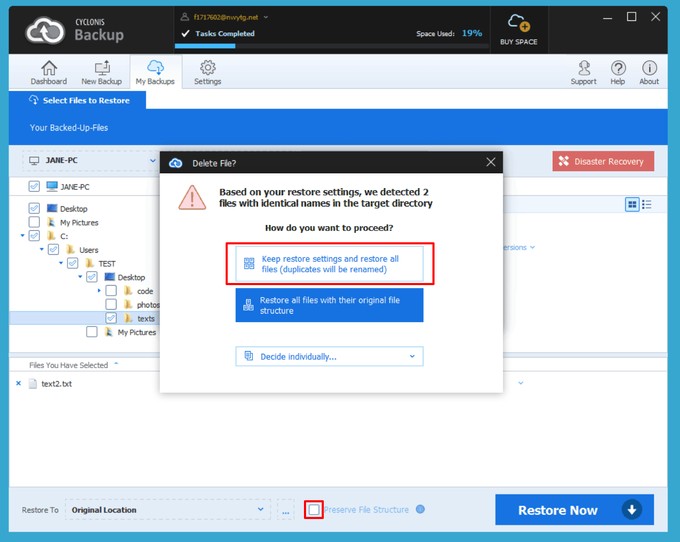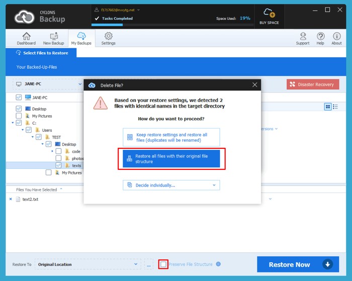- If you select Restore all files with their original file structure, Cyclonis Backup will simply reproduce the file structure in the same way they've been backed up.