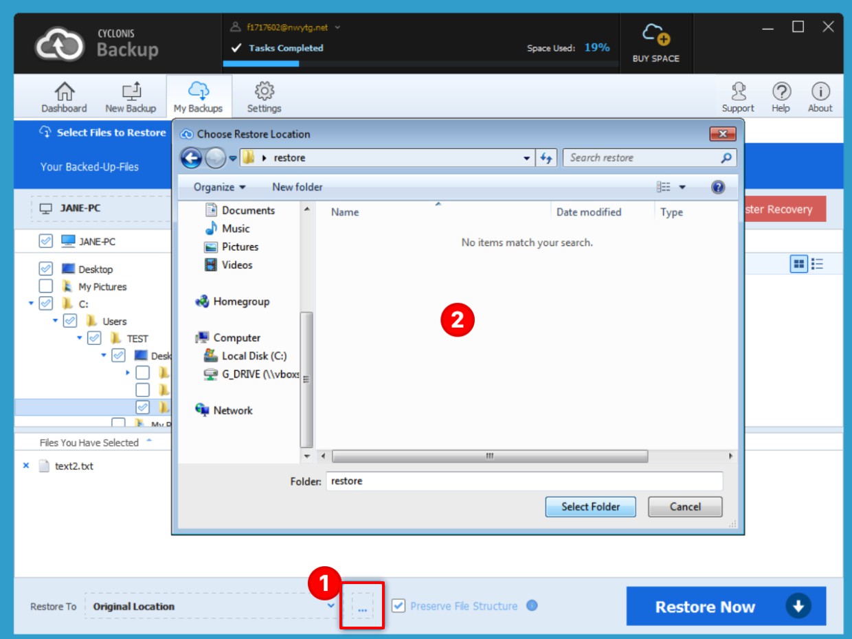 (1) next to the Restore to drop-down and navigate to the location where you would like to restore your files (2).