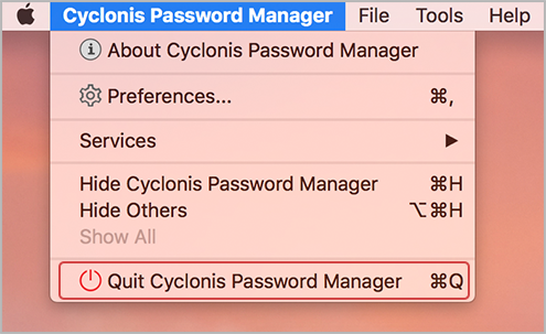 - Click Cyclonis Password Manager in the Application menu at the top and select Quit Cyclonis Password Manager.