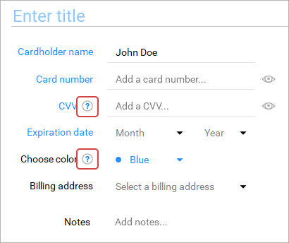 - Billing Address (Optional) - You may also select a billing address for the credit card. To do so, you must first add the billing address to a profile that is stored in your vault. The billing address should then be visible in this drop-down menu.