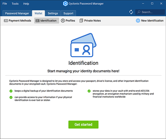 If you have not yet added any identification documents to your Cyclonis Password Manager Wallet, you should see the following screen when you click on the Identification tab: