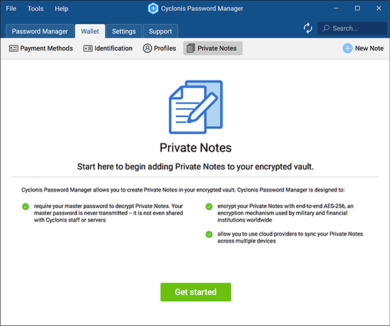 If you have not yet added any Private Notes to your Cyclonis Password Manager Wallet, you should see the following screen when you click on the Private Notes tab: