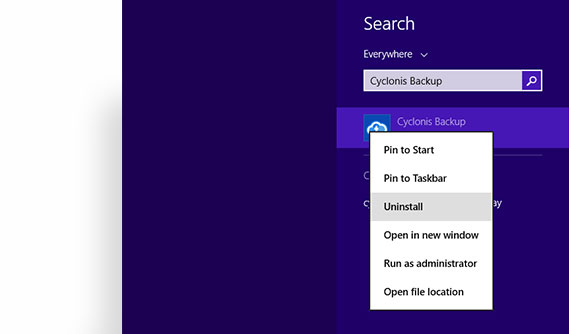 Right-click on the Cyclonis Backup icon and select Uninstall.