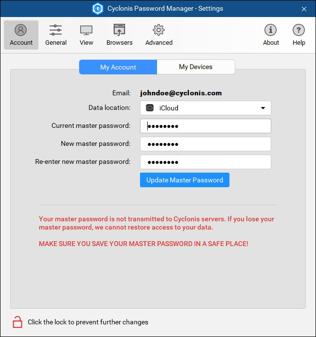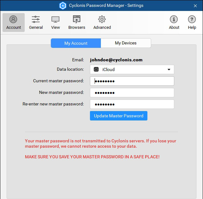 The first line of defense is the complexity of your master password. Cyclonis Password Manager will ask you to create your own custom master password. To improve the security of your account, your master password should be at least eight characters long, have at least one lowercase letter, have at least one uppercase letter, and contain at least one number. This configuration helps to make your master password difficult to guess. Your master password is for your eyes only – by design, not even Cyclonis staff and servers have access to your passwords and data and we cannot provide them to you in the event you should forget or lose it.