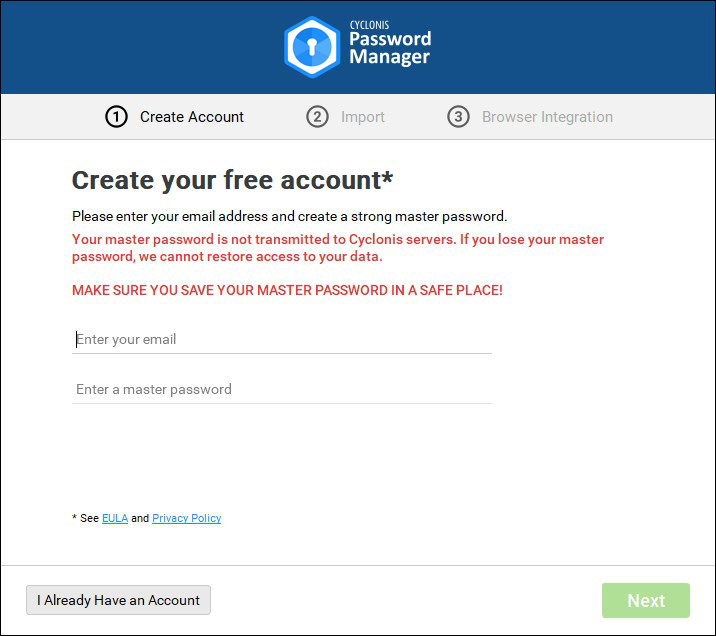 Once you download and install the Cyclonis Password Manager on a desktop or mobile device, you'll need to create your account. It's as easy as providing a valid email address and creating a strong master password. A verification code will be emailed to you to make sure that the email address you have provided is valid and active. Once you enter the verification code into the application, you'll be ready to start exploring Cyclonis Password Manager's features.