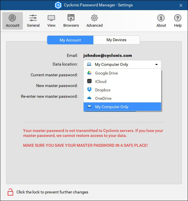 That's up to you. You can take full advantage of Cyclonis Password Manager's multiple device synchronization features with its built-in option to use supported third-party cloud storage accounts, selected by you, to store your personal encrypted vault. Cyclonis presently integrates with Cyclonis Cloud, Dropbox, Google Drive, Apple iCloud, and Microsoft OneDrive. You can also choose to store your vault locally on your device. Keep in mind that Cyclonis Password Manager WILL NOT automatically sync your data across multiple devices if you select the local storage option. Cyclonis Password Manager will ask you where you want to store your vault when you install it. You can change the location of your vault at any time by going to Settings. The vault data sent to your selected cloud storage provider is encrypted with AES-256 encryption and your master password. Your master password, which is required to unlock your vault, is not sent by Cyclonis Password Manager to the cloud storage provider, or anywhere else.
