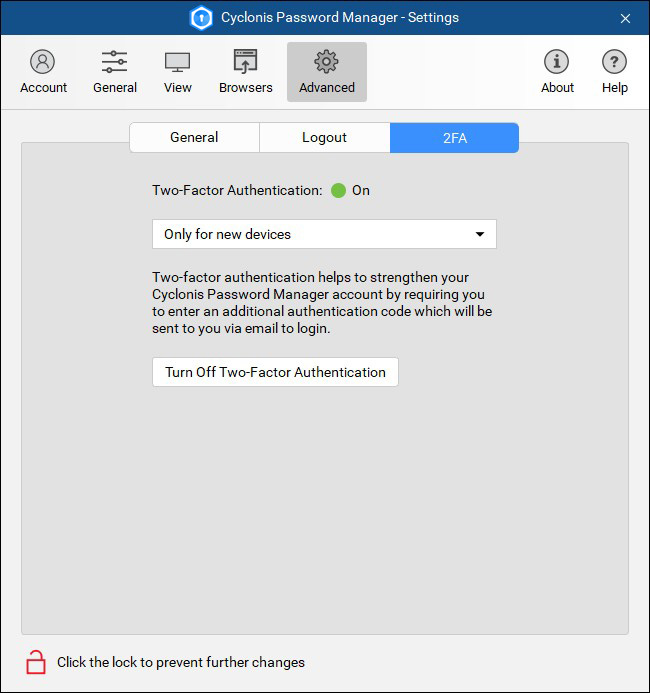The Cyclonis Password Manager two-factor authentication feature is optional and can be turned ON or OFF if you choose to. To manage two-factor authentication for your Cyclonis Password Manager account, go to Settings. Click on the Advanced tab, and then click on the red padlock at the top-right corner of the screen, if present. You may need to provide your master password in order to be able to make changes. Scroll down to the 2FA section. You have the option of turning ON 2FA only for login attempts from new devices, or alternatively for every login attempt, regardless of the device used. You can also turn 2FA OFF by clicking the Turn Off Two-Factor Authentication button (see screenshot).