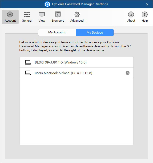 If you lose a device on which you have Cyclonis Password Manager installed, you should install and/or log in to Cyclonis Password Manager on a different device. When you have logged in, you should immediately locate the lost or stolen device in the Settings > Main > My Devices section and remove it from your Cyclonis Password Manager account by clicking the "X" button next to it (see screenshot). The purpose of this feature is to invalidate that device and prevent it from accessing your vault.