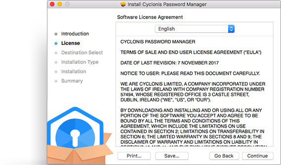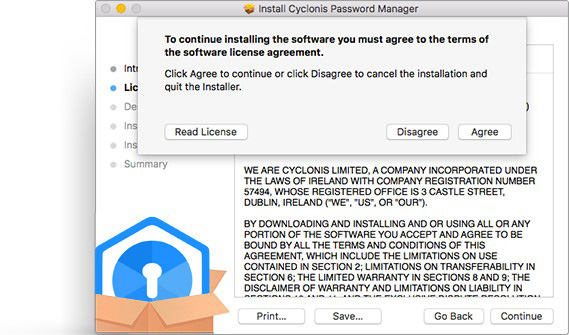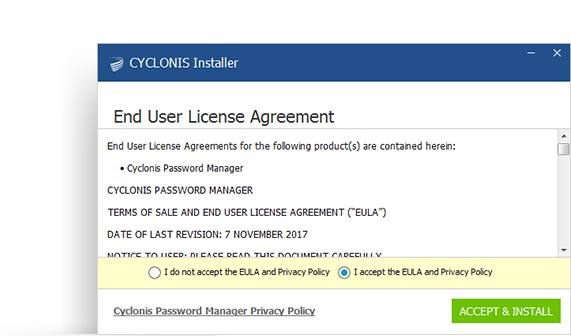 A window displaying Cyclonis Password Manager’s EULA, Privacy Policy and Discount Terms will appear.