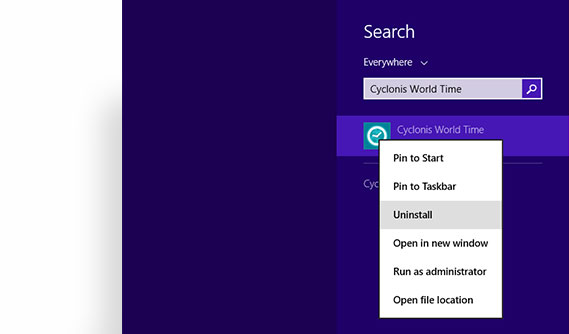 Right-click on the Cyclonis World Time icon and select Uninstall.