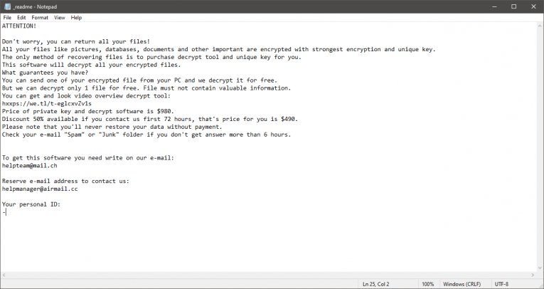 Sspq Ransomware's creators promise to deliver a decryptor to all victims who agree to pay some money via Bitcoin, but we would not advise you to trust them. They ask for a payment of $980, but offer a 50% discount ($490) if the victim pays within three days of the attack. The criminals provide two emails for contact – helpteam@mail.ch and helpmanager@airmail.cc. The full version of their message is stored in the file '_readme.txt' that the Sspq Ransomware drops after the attack.