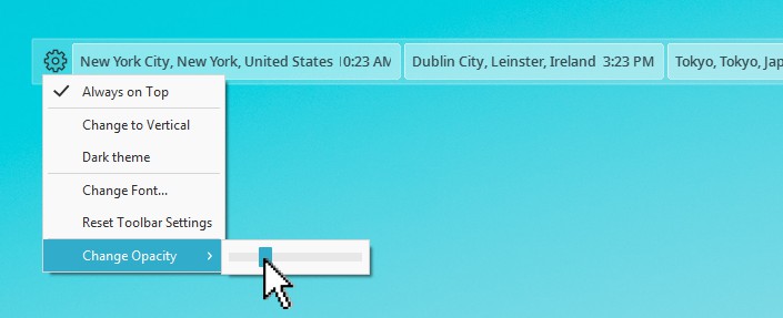 “齒輪” 圖標菜單還具有 “不透明度” 設置。如果用鼠標將鼠標懸停在它上面,則會出現一個滑塊。您可以向左或向右移動滑塊以改變Cyclonis世界時間桌面小部件的不透明度。