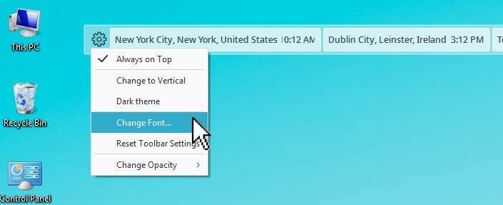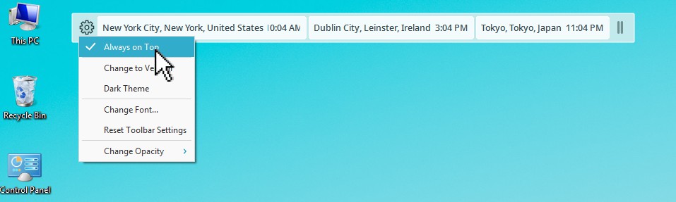 如果選擇 總是在最上 ,Cyclonis世界時間桌面小部件將保留在其他窗口之上,並且應始終可見。如果未啟用此選項,則可以通過右鍵單擊Cyclonis世界時間系統托盤圖標並選擇 “顯示時鐘” 來使桌面窗口小部件可見 。