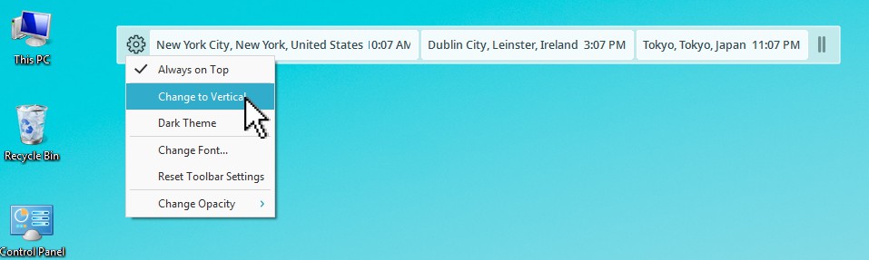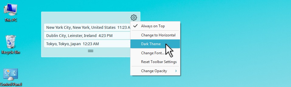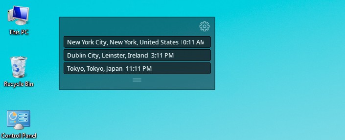 您可以通過單擊Cyclonis世界時間桌面小部件並將其拖動到桌面上的首選位置來定位它。在Cyclonis世界時間桌面小部件的 齒輪 圖標,可以訪問它的自定義選項。