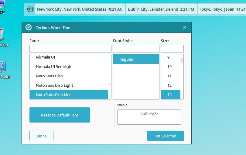 要確認您的選擇,請單擊 “設置所選” 。要將字體重置為Cyclonis世界時間的默認設置,請單擊 “重置為默認字體” 。
