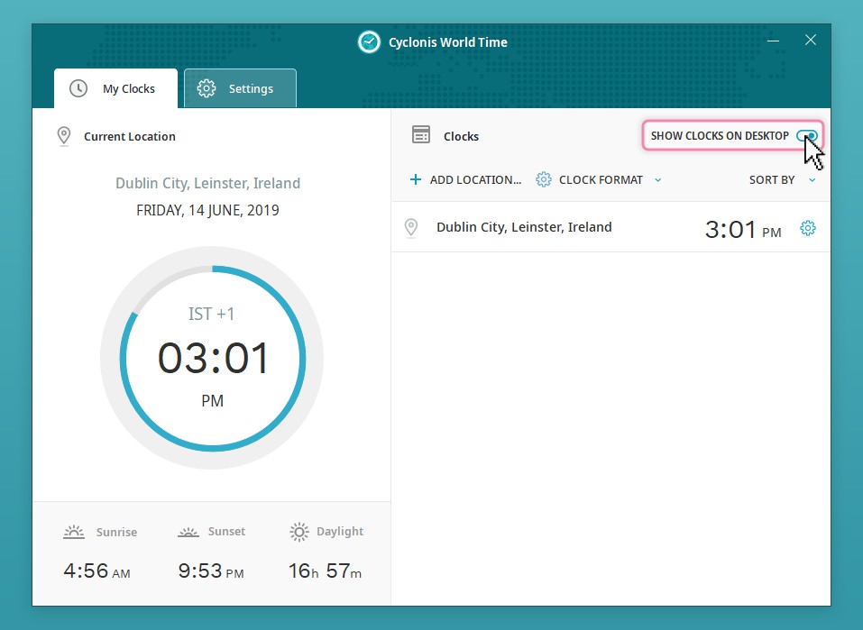 Cyclonis世界時間的桌面小部件可以直接在計算機桌面上方便地顯示所選位置的當前時間。可以在方便時激活和停用此有用功能。只需打開Cyclonis世界時間應用程序,選擇 My Clocks 選項卡並啟用或禁用 在桌面上顯示時鐘 開關。